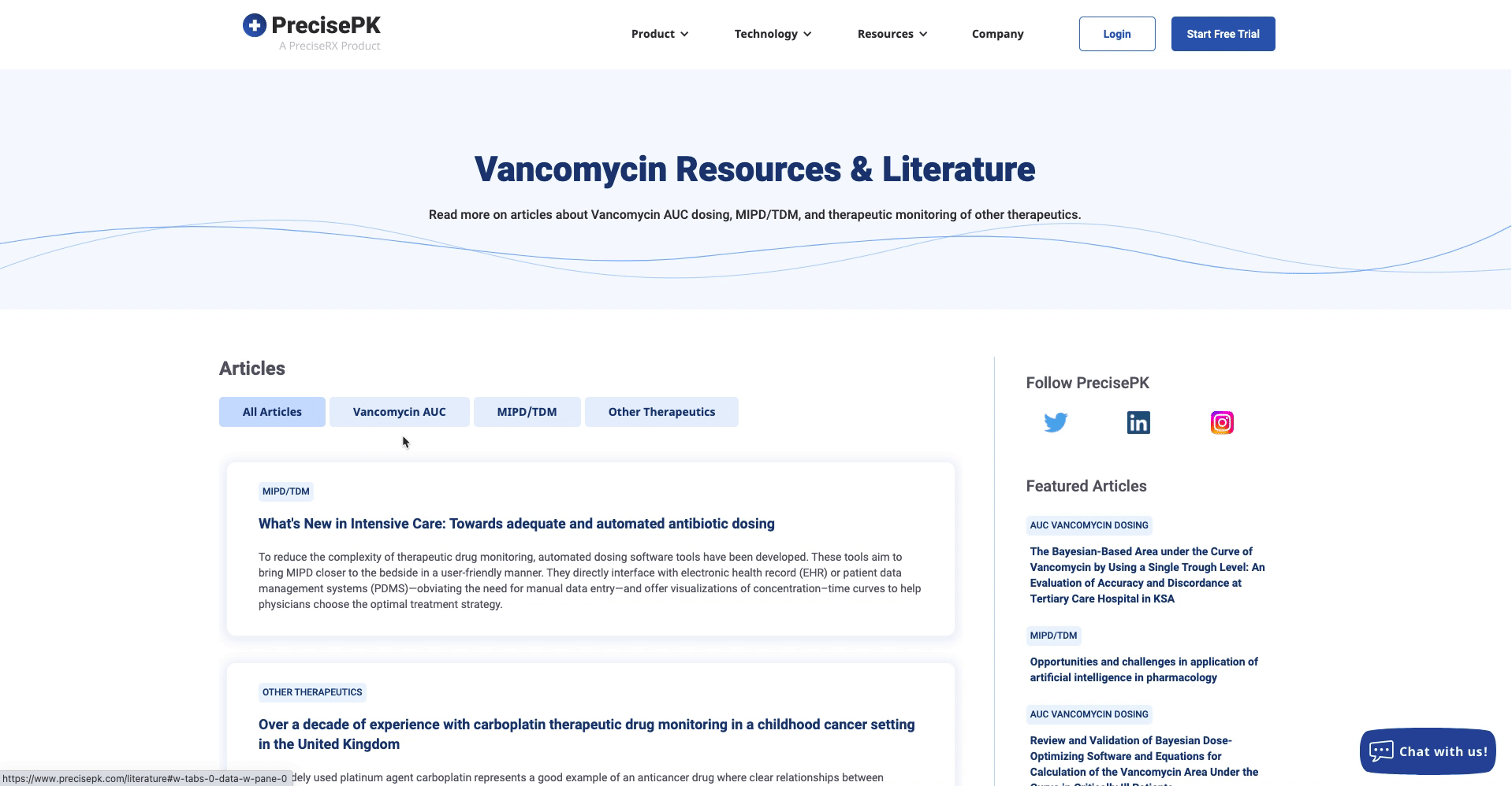 As part of PrecisePK’s continuous growth, a Literature page was also created further bring visitors to our website and increase engagement by providing valuable resources and educational materials on Vancomycin AUC Dosing, MIPD (Model-Informed Precision Dosing), TDM (Therapeutic Drug Monitoring), and information on other therapeutics. This curated collection includes research papers, case studies, and scientific articles that not only demonstrate the company’s commitment to staying at the forefront of pharmacokinetic research, but also offering a centralized platform for healthcare professionals to access relevant literature to grow their knowledge and trust in PrecisePK’s expertise.