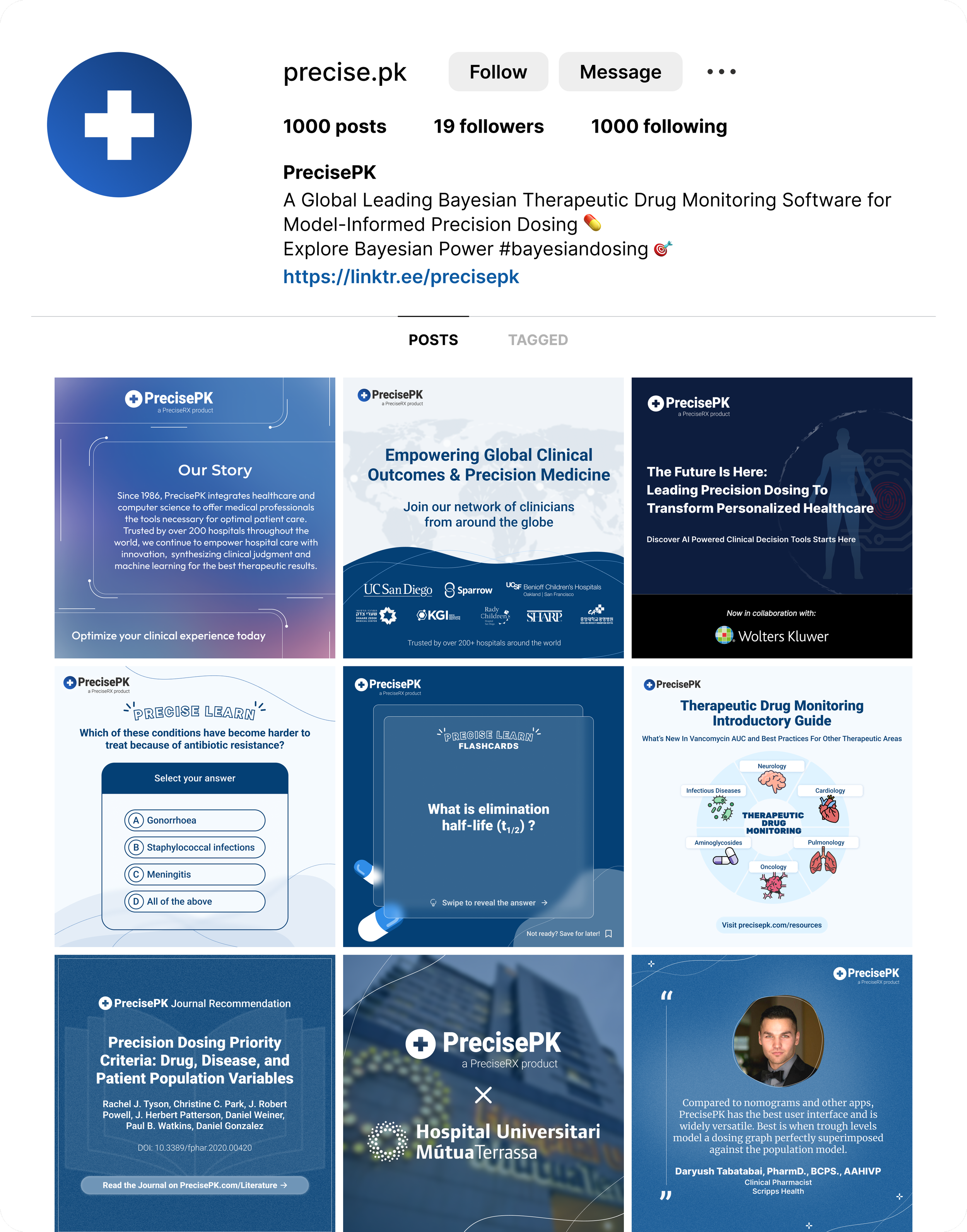 Overcoming Market Competition. PrecisePK faced competition that was regularly active on social media, which required us to find unique ways to differentiate ourselves and communicate our value effectively. The team worked together on identifying our key differentiators and our best features to develop a compelling messaging strategy. We focused on highlighting Bayesian dosing, our wide drug range, and being able to treat a diverse population. By emphasizing our unique value proposition and demonstrating our expertise, we were able to overcome market competition and gain traction in the healthcare industry.