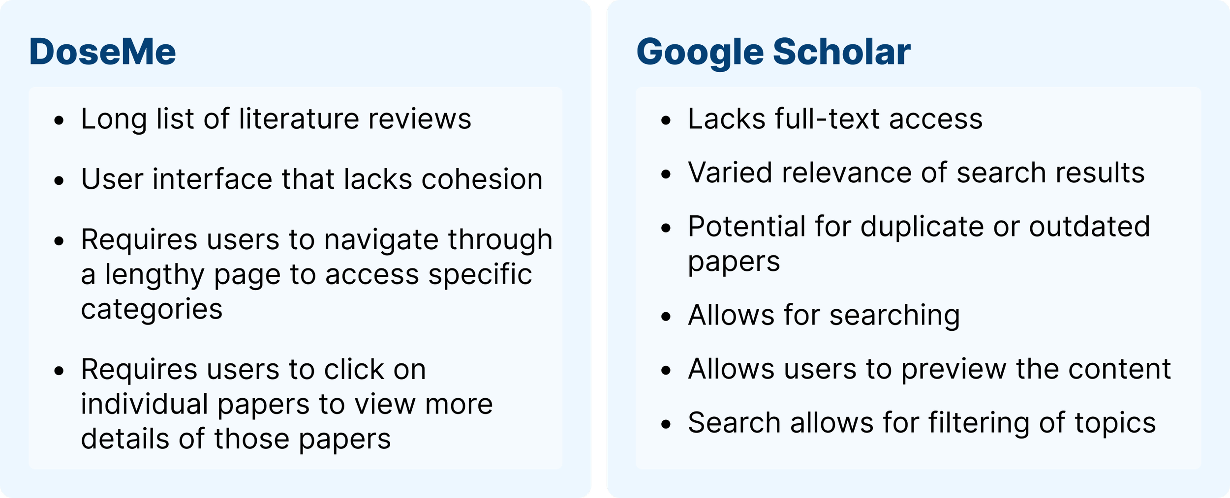 By understanding what some of our competitors literature/resources page contain or lack, I was able to create a literature page that allows users to see all the categories available, provide a consistent user interface, and include a short summary for each research article so users have the option to click directly and visit the full article. In PrecisePK’s literature page, I’ve also provided a column for featured articles and ensure that we only provide articles with full-text access.